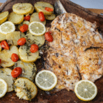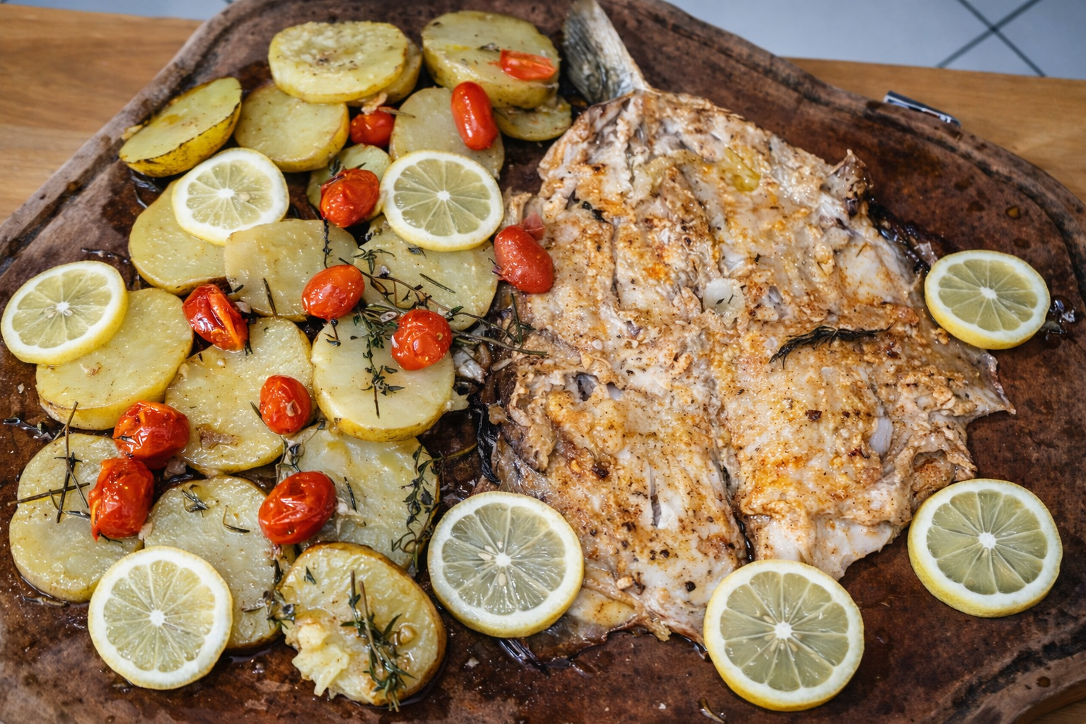Tainha Espalmada com Batatas e Tomate Cereja no Forno